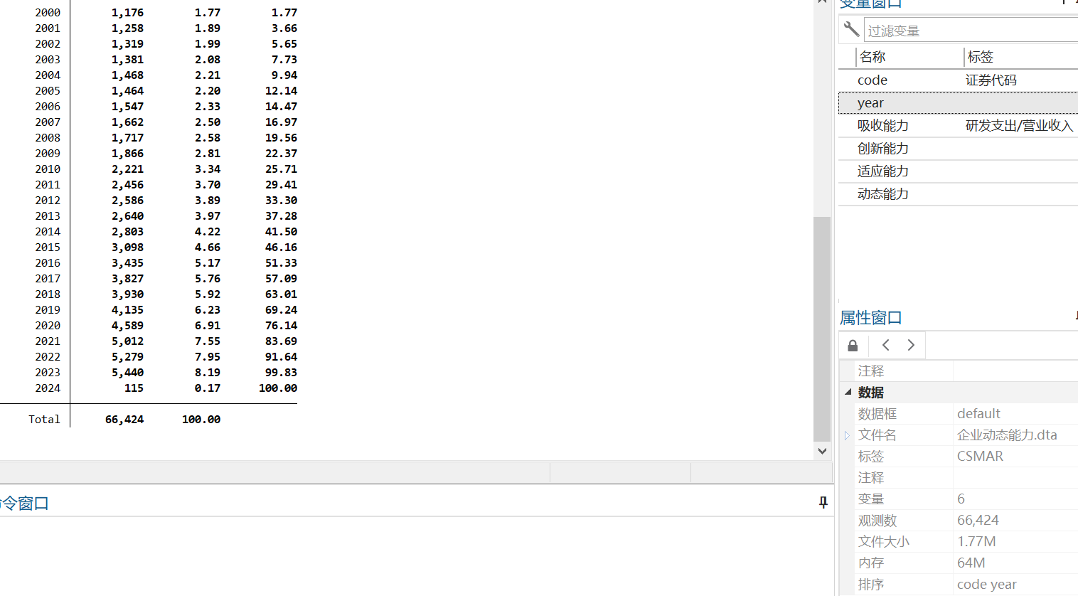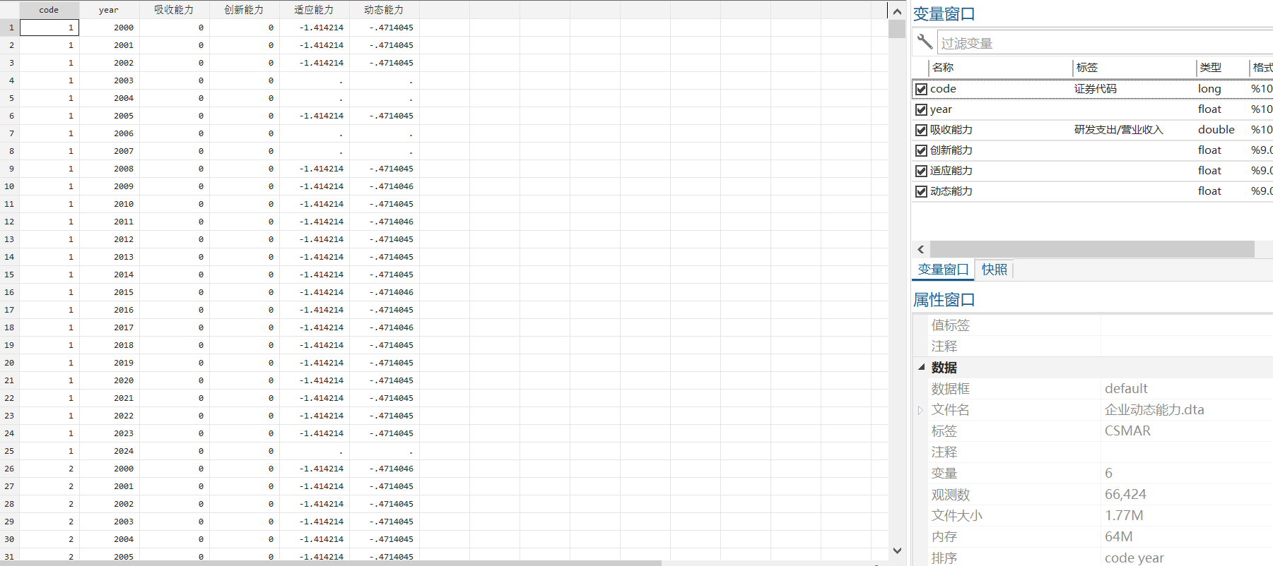 数据指标:包含股票代码、年份、吸收能力、创新能力、适应能力、动态能力等字段。详见商品图,仅预览。