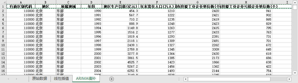 ARIMA填补。基于ARIMA模型,利用同一地区的时间序列数据,对缺失值进行预测填补。