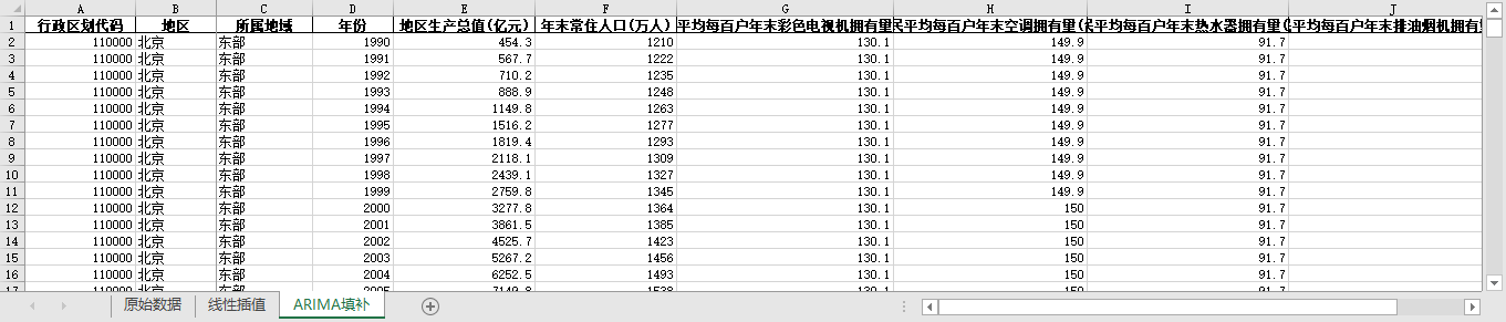 ARIMA填补。基于ARIMA模型,利用同一地区的时间序列数据,对缺失值进行预测填补。