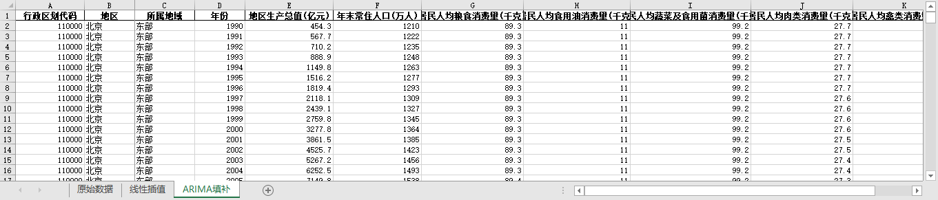 ARIMA填补。基于ARIMA模型,利用同一地区的时间序列数据,对缺失值进行预测填补。
