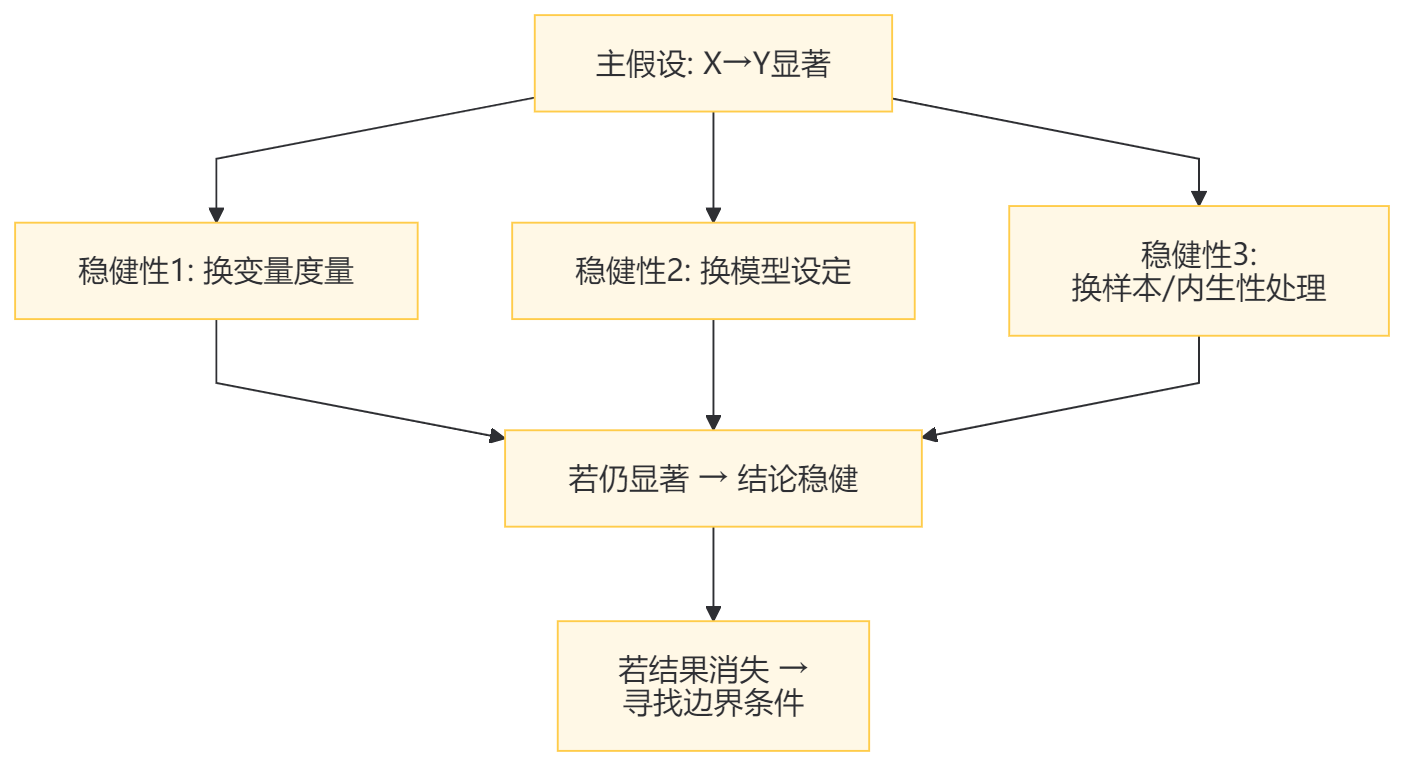 “先跑主回归,再用‘换变量、换模型、换样本’三把刀各砍一刀;三刀下去仍显著,就可放心写结论。”