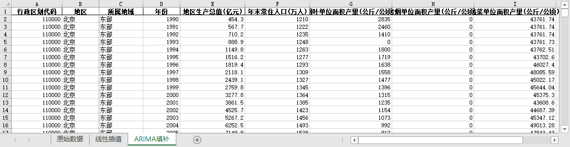 ARIMA填补。基于ARIMA模型,利用同一地区的时间序列数据,对缺失值进行预测填补。