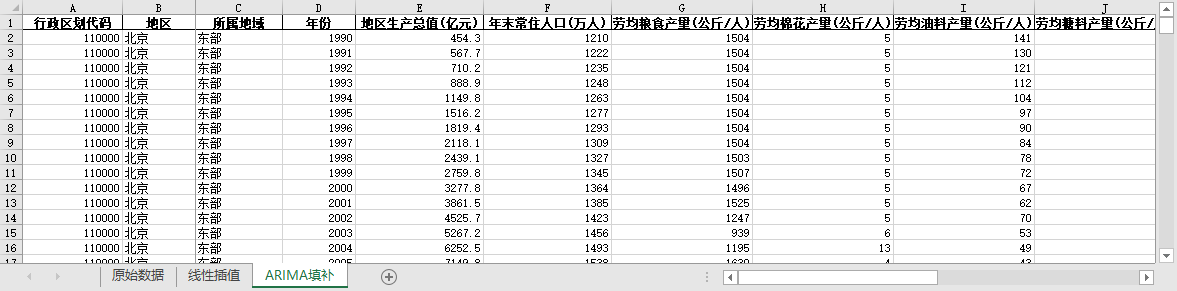 excel数据文件包原始数据(由于多年度指标不同存在缺失值)、线性插值、ARIMA填补三个版本,提供您参考使用。