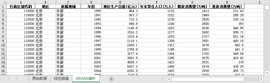 ARIMA填补。基于ARIMA模型,利用同一地区的时间序列数据,对缺失值进行预测填补。