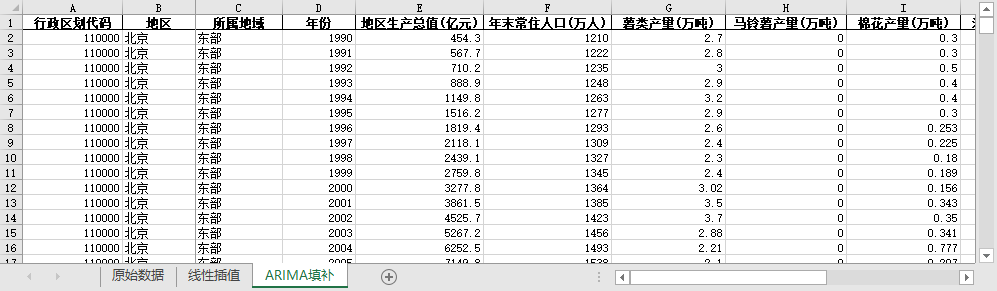 ARIMA填补。基于ARIMA模型,利用同一地区的时间序列数据,对缺失值进行预测填补。