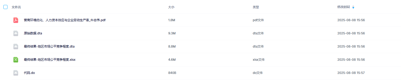 四、参考文献牛志伟,许晨曦,武瑛.营商环境优化、人力资本效应与企业劳动生产率[J].管理世界,2023,39(02):83-100.