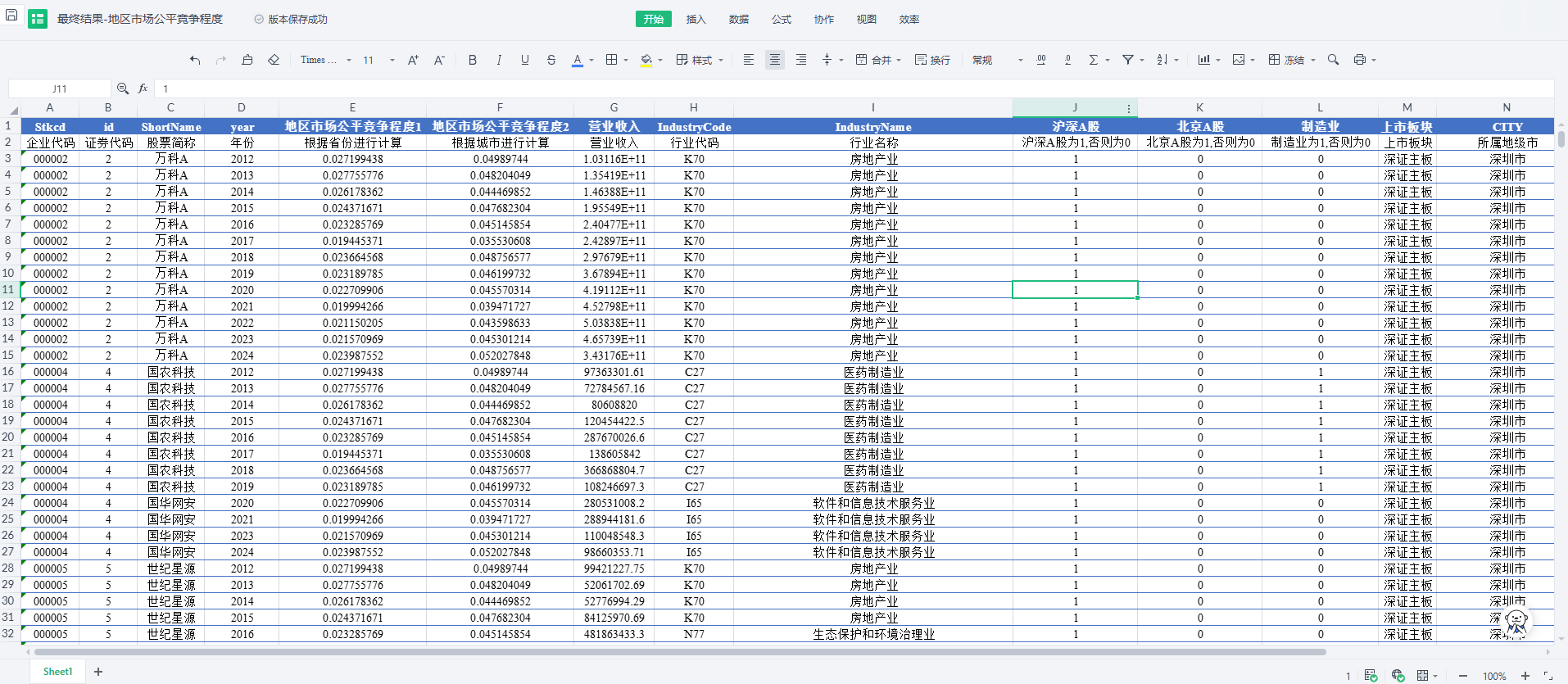 三、计算方式地区市场公平竞争程度1:参照HHI的算法,按照地区(省份)上市公司营业收入计算地区市场公平竞争程度