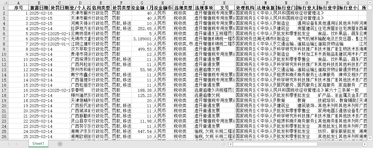 本次分享的数据是全国范围内涉及税收行政处罚的企业信息,涵盖了处罚金额超过1万元的案件。违规事项包括未按时申报、未按时缴纳税款、虚开增值税专用发票、虚开普通发票、偷税、违反税收管理规定、逃避追缴欠税以及骗取出口退税等行为。数据范围为1990-2025.2,希望对大家有用