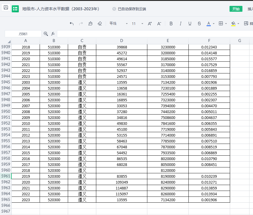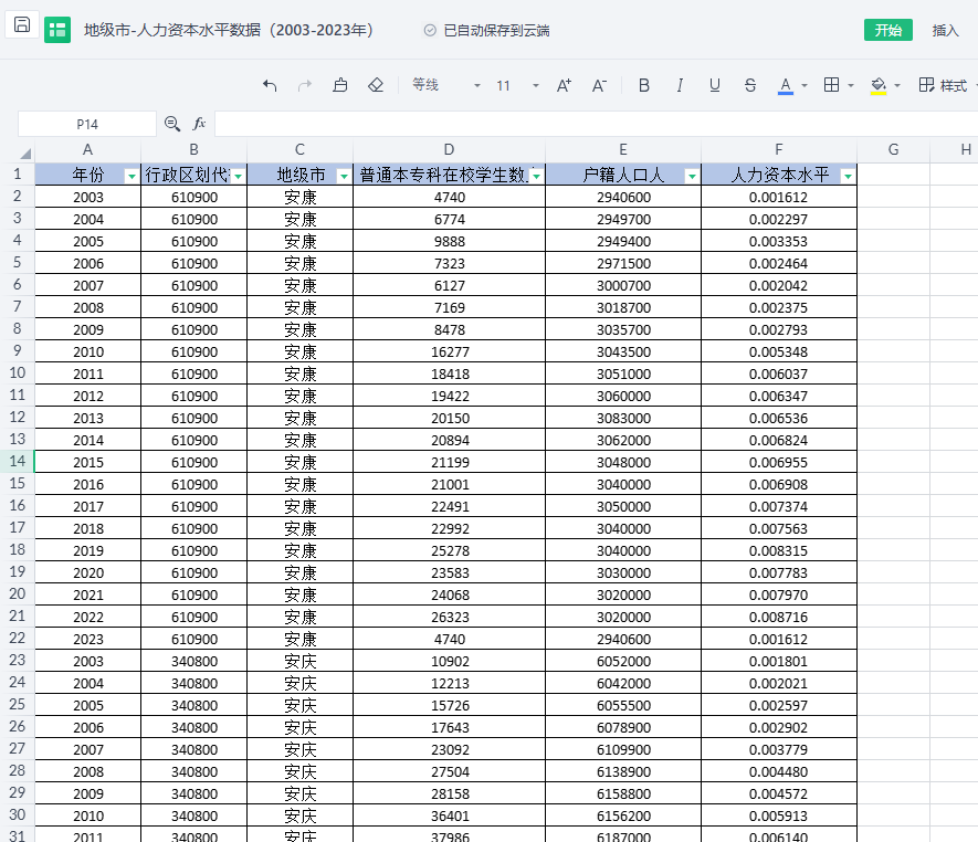 包含指标:年份、行政区划代码、地级市、普通本专科在校学生数人、户籍人口数、人力资本水平