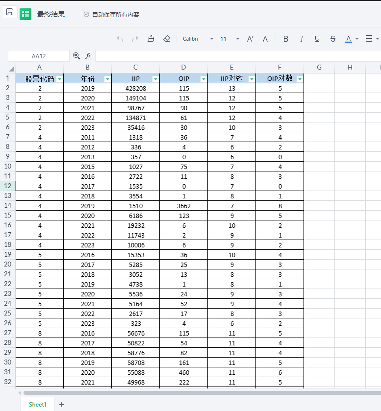 包含指标:股票代码、年份、IIP、OIP、IIP对数、OIP对数