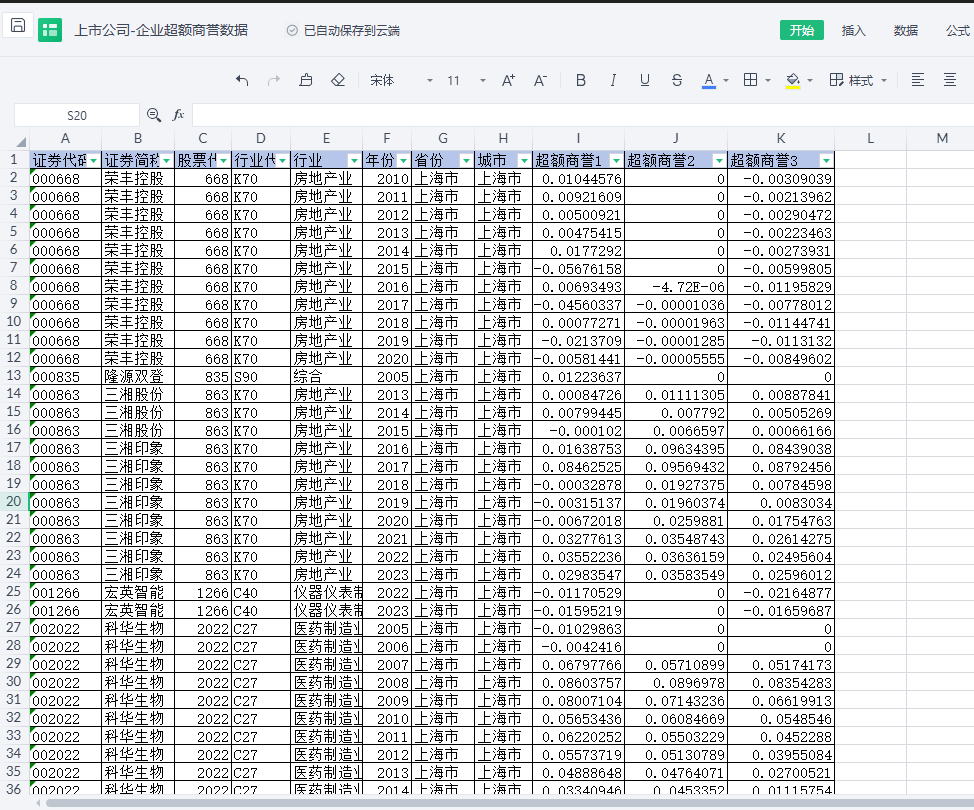 包含指标:证券代码、证券简称、股票代码、行业代码、行业、年份、省份、 城市、超额商誉1、超额商誉2、超额商誉3