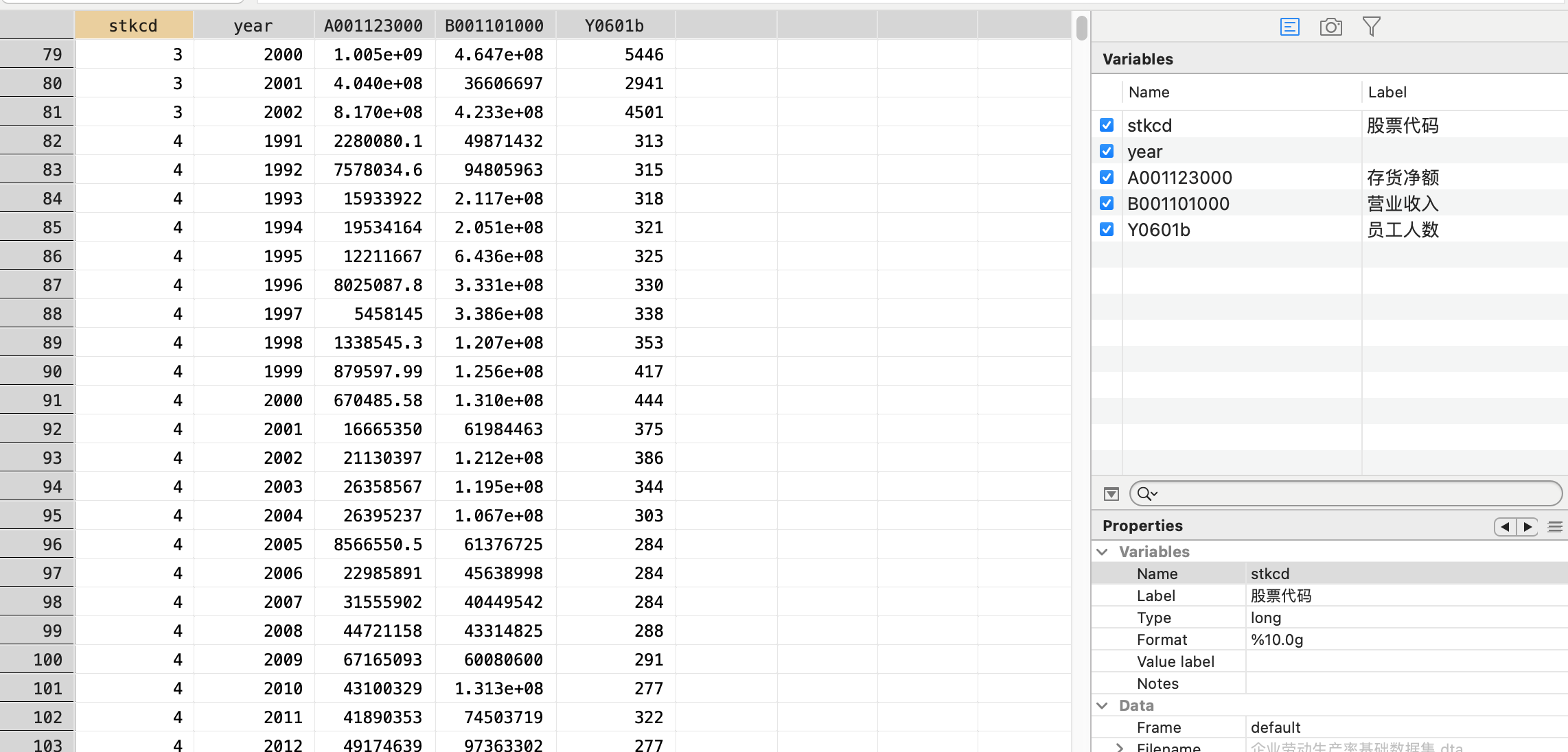 2、参考《管理科学学报》李广众(2018)老师的研究,使用(销售收入+存货变动)/员工人数,取对数,测度企业劳动生产率