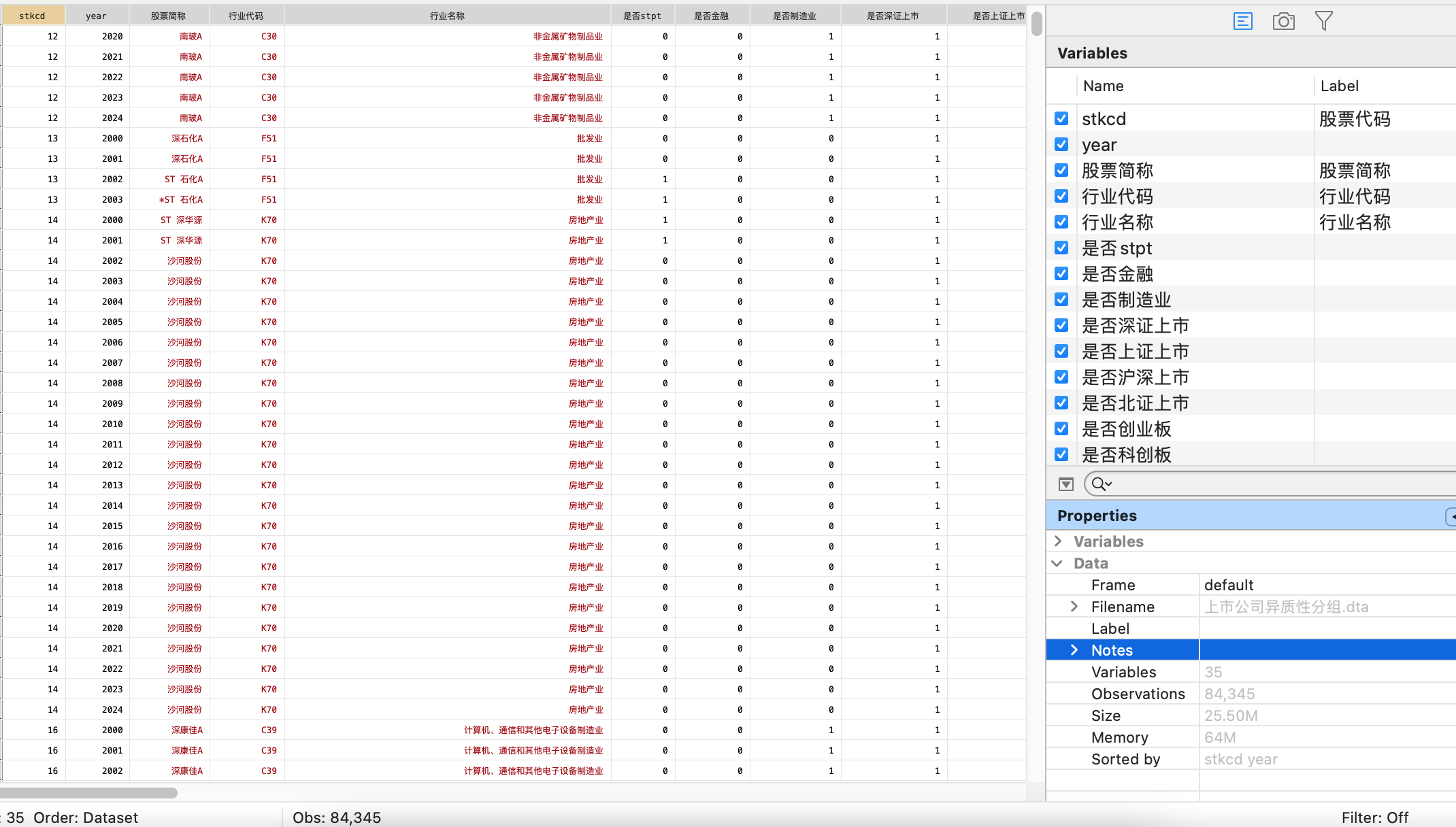 Stkcd、year、股票简称、行业代码、行业名称、是否stpt、是否金融、是否制造业、是否深证上市、是否上证上市、是否沪深上市、是否北证上市、是否创业板、是否科创板、重污染分组1、重污染分组2、重污染分组3、所属省份代码、所属省份、所属城市代码、所属城市、是否属于西部、是否属于东部、是否属于中部、产权性质、是否高科技行业1、是否高科技行业2、是否高科技行业3、是否高科技行业4、是否高科技行业5、技术密集型、资产密集型、劳动密集型