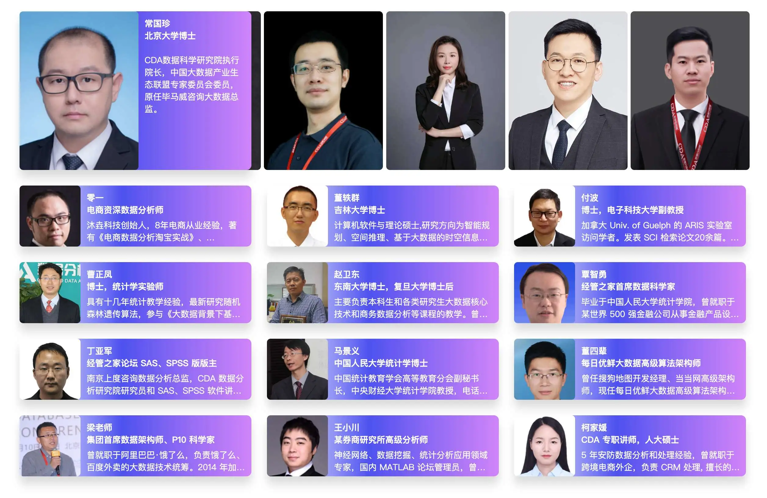 专注数据科学前沿技术、人才培养17年、往期学员超百人成为数据科学家,培训学员10万+吸引世界名校学员总数超5000 (哥伦比亚大学、清华大学、北京大学、人民大学等)全国30万+的数据分析从业者,有10万在CDA,行业大咖师资203位、名企内训合作118家、公益直播730场沙龙会议318期。