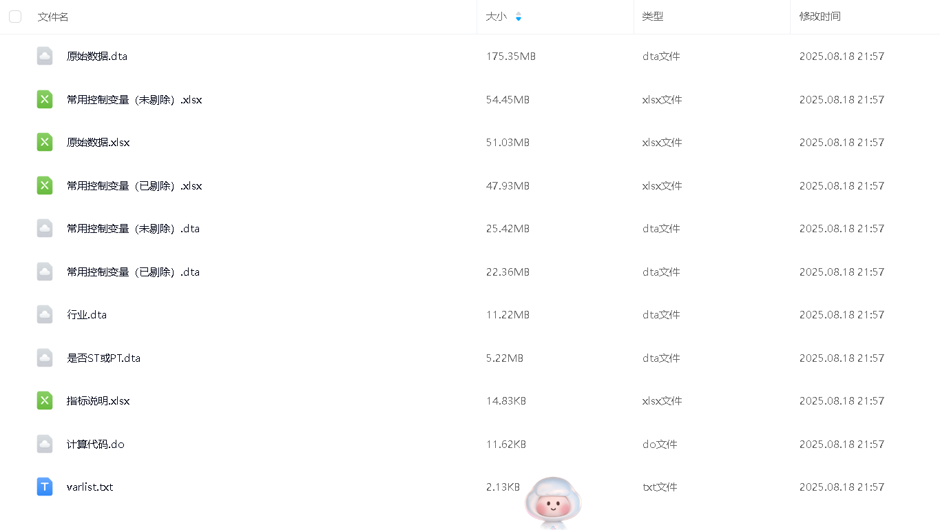 数据格式:包括Excel、dta(包含未处理原始数据,剔除金融剔除ST或PT,缩尾和未缩尾版本)、dofile、最终结果、数据说明、详细的数据构建(代码形式)