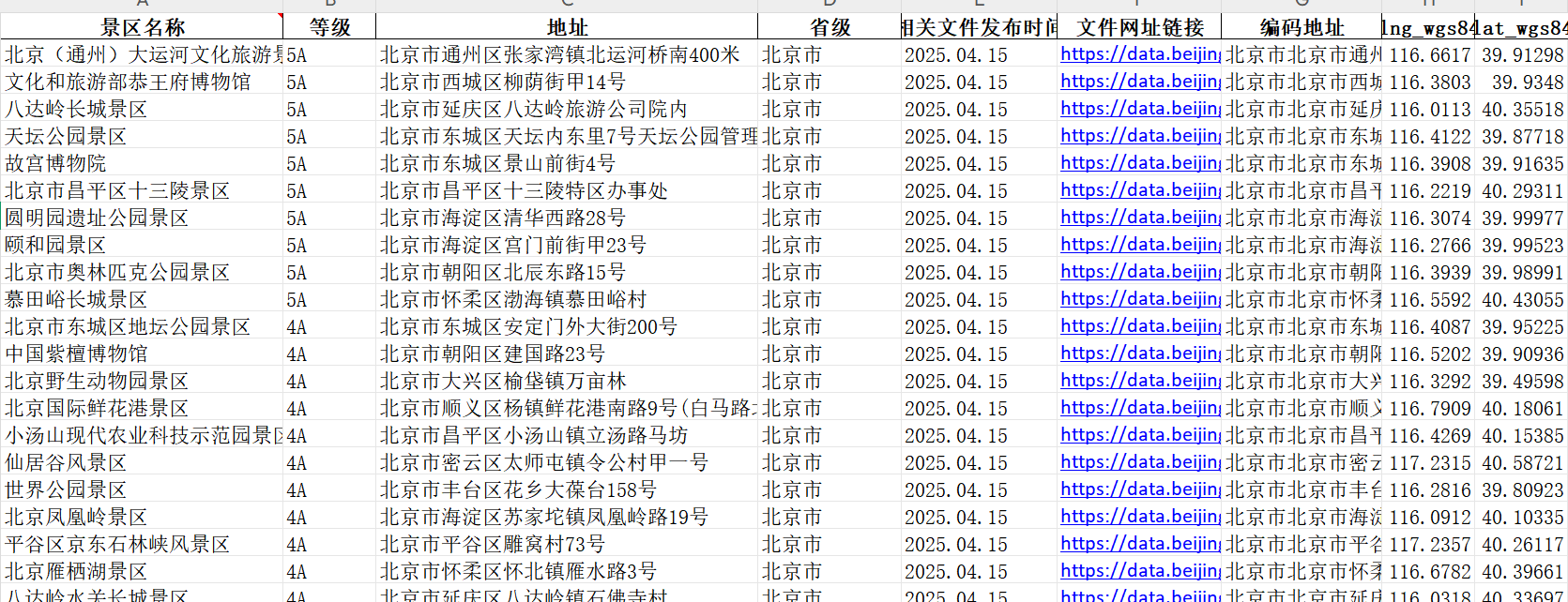 数据整理全国A及至5A及各个景区的基本信息景区名称、等级、所属省份城市区县、坐标、地址以及评定时间等。截止2025年5月份全国31个省份最新