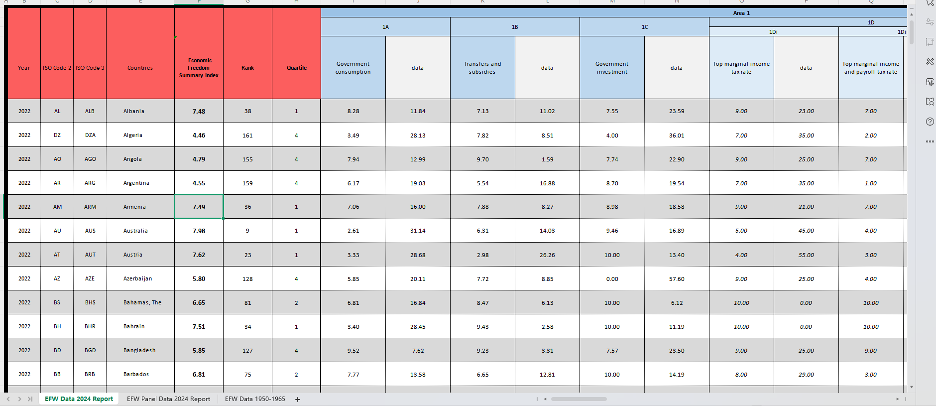 1950-2022年全球经济自由指数(政府规模法律体系货币稳定性国际贸易自由监管)面板数据