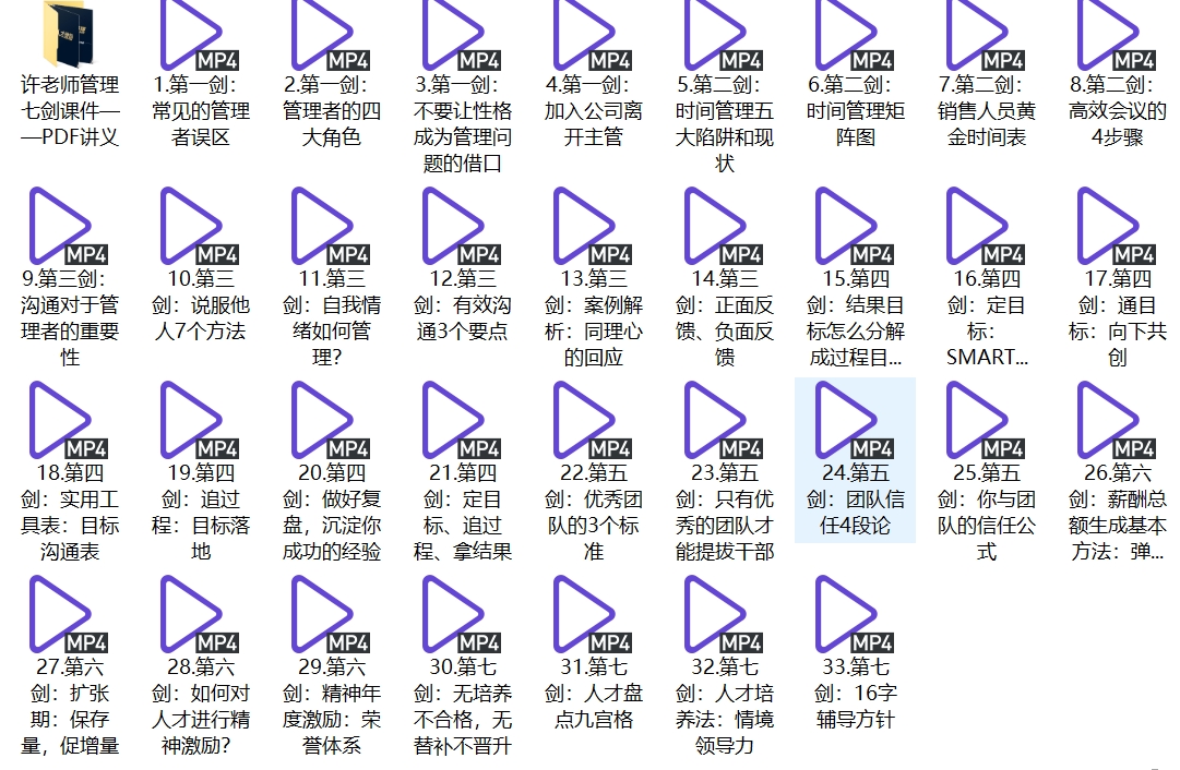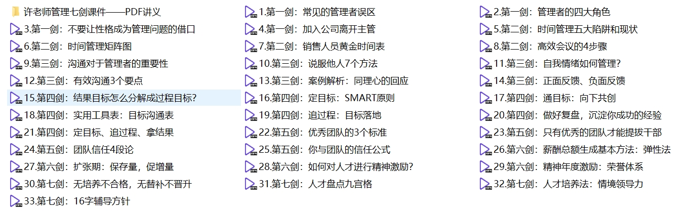 [color=rgba(0, 0, 0, 0.9)]《管理七剑》的培训视频和讲义包括33个视频和讲义。