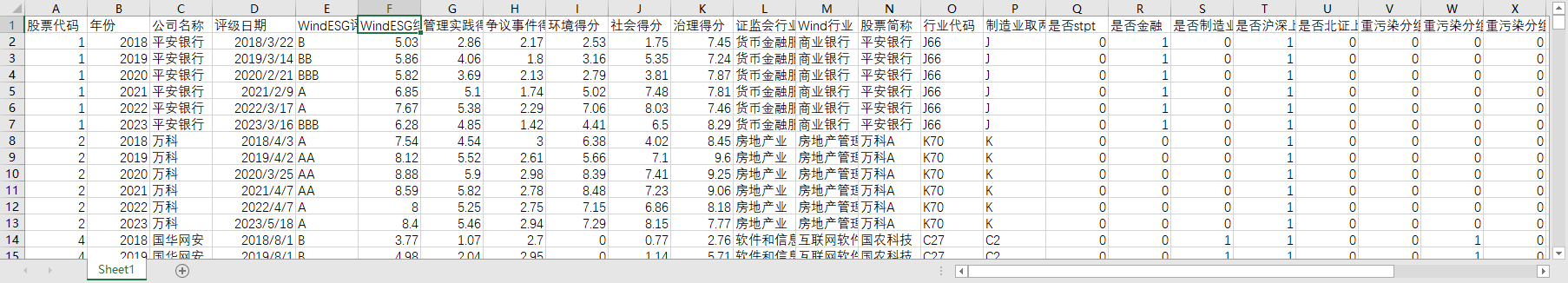 股票代码 年份 公司名称 评级日期 WindESG评级 WindESG综合得分 管理实践得分 争议事件得分 环境得分 社会得分 治理得分 证监会行业 Wind行业 股票简称 行业代码 制造业取两位代码其他行业用大类 是否stpt 是否金融 是否制造业 是否沪深上市 是否北证上市 重污染分组1 重污染分组2 重污染分组3 所属省份代码 所属省份 所属城市代码 所属城市 是否属于西部 是否属于东部 是否属于中部 产权性质
