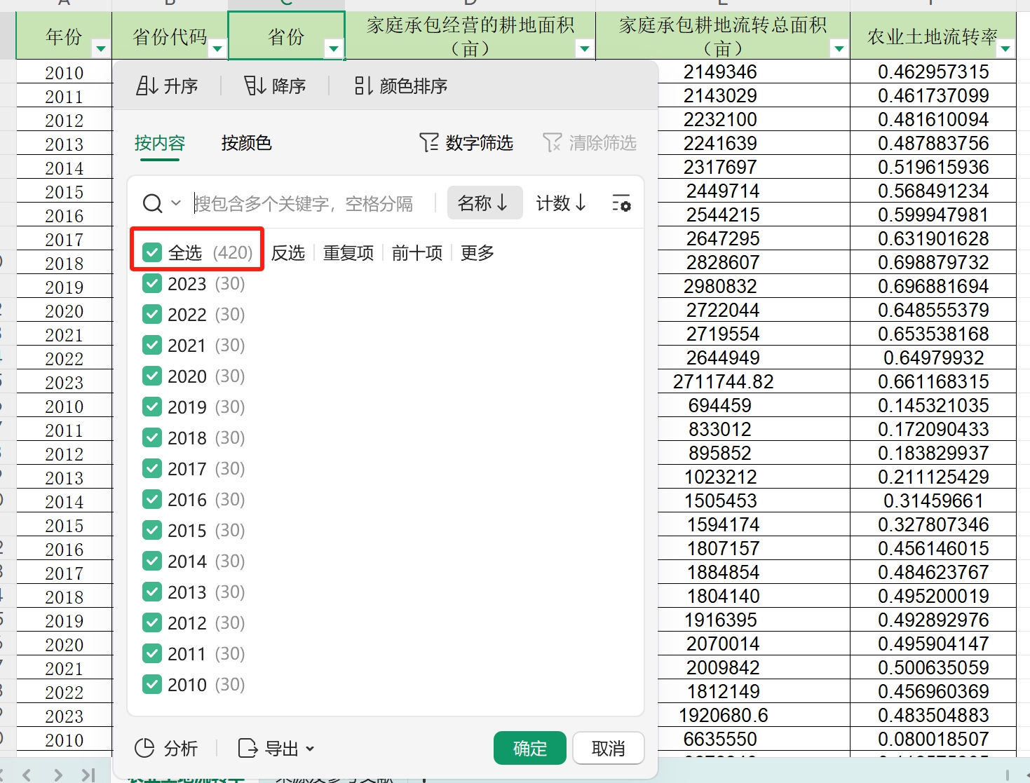 年份 代码 省份 家庭承包经营的耕地面积(亩) 家庭承包耕地流转总面积(亩) 农业土地流转率