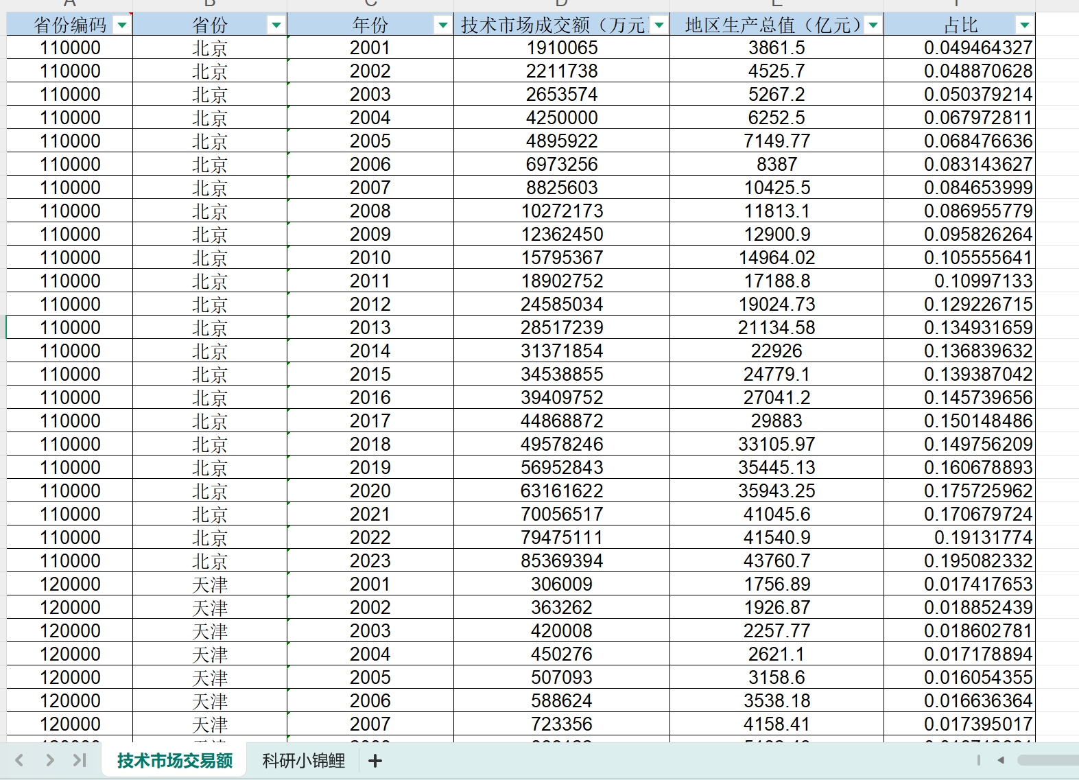 id、省份、年份、技术市场成交额(万元)、GDP、占比