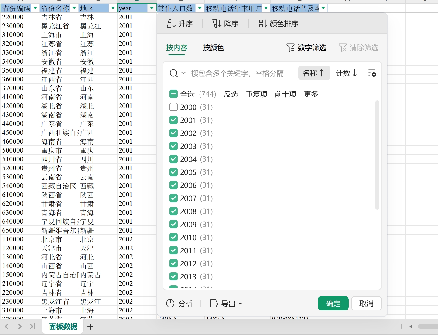 具体指标:省份编码、省份名称、地区、year、常住人口数(万人)、移动电话年末用户(万户) 、移动电话普及率