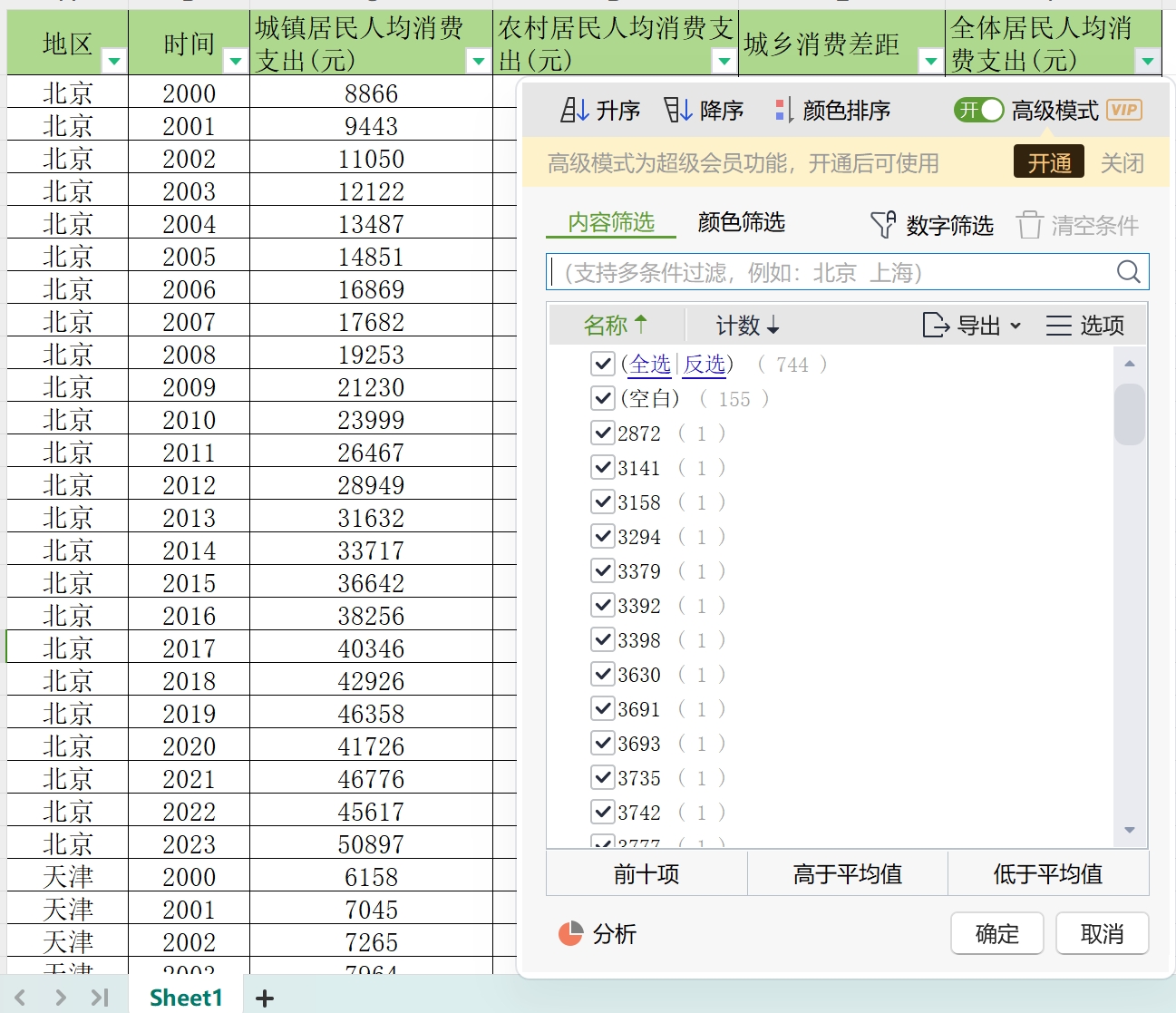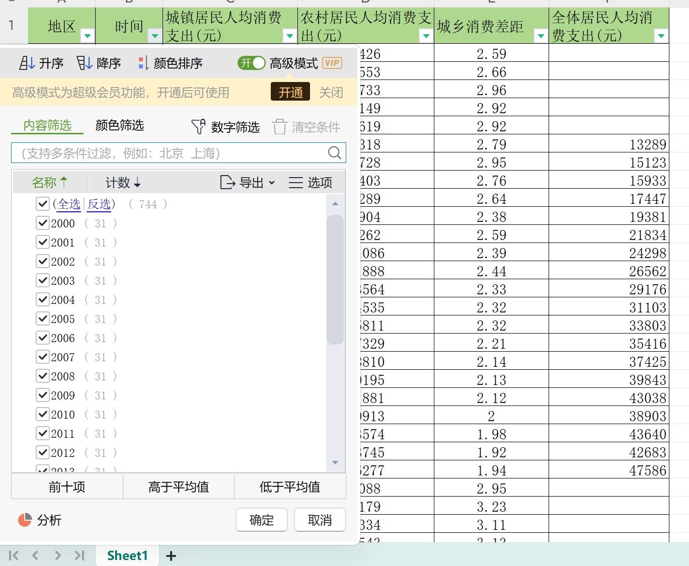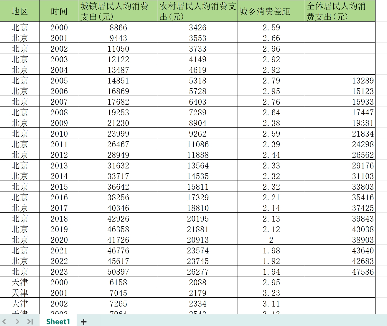地区、时间、城镇居民人均消费支出(元) 2000-2023年、农村居民人均消费支出(元) 2000-2023年、城乡消费差距2000-2023年、全体居民人均消费支出(元) 2005-2023年。