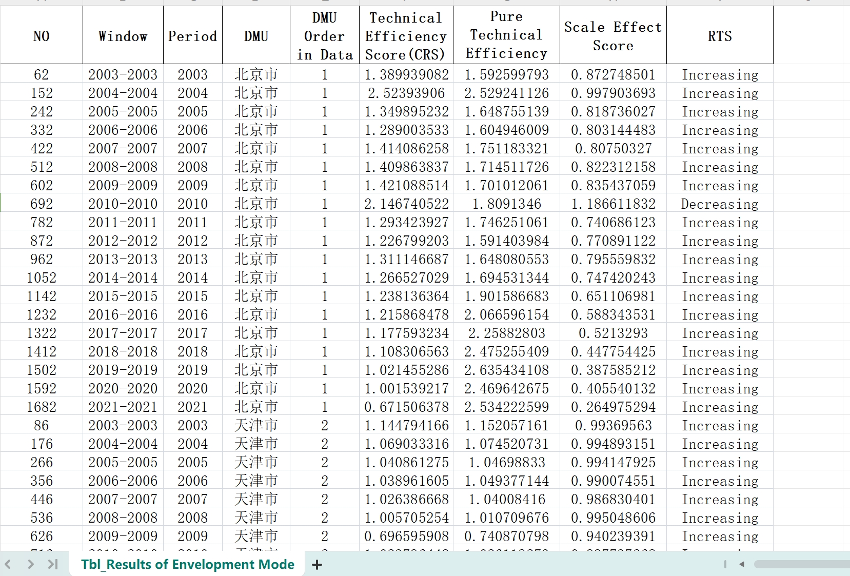 本数据有超效率SBM投入导向VRS、非期望产出SBM投入导向。分为Technical Efficiency Score(CRS) 、Pure Technical EfficiencyScore(VRS) 和Scale Effect Score,具体见图