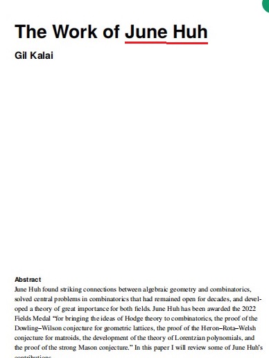 美国普林斯顿大学数学系教授,韩国裔教授许埈珥获得2022年菲尔兹奖,介绍说:许埈珥将霍奇理论(Hodge theory)引入到组合学中,证明了几何格上的道林—威尔逊猜想(Dowling–Wilson conjecture)、拟阵上的海伦—罗塔—威尔士猜想(Heron–Rota–Welsh conjecture)、强梅森猜想(strong Mason conjecture),推动了洛伦兹多项式理论(theory of Lorentzian polynomials)的发展。