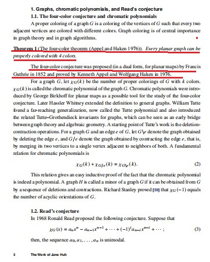 许埈珥说:“定理1(四色定理(阿佩尔与哈肯,1976年))。每个平面图都可以用4种颜色进行恰当着色。四色猜想最初由弗朗西斯·格思里于1852年提出(针对平面地图的对偶形式),后经肯尼斯·阿佩尔和沃尔夫冈·哈肯于1976年证明”。