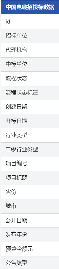 - 结构化程度高:字段信息完整,包含招标单位、代理机构、中标单位、流程状态、预算金额、项目编号等标准化字段。