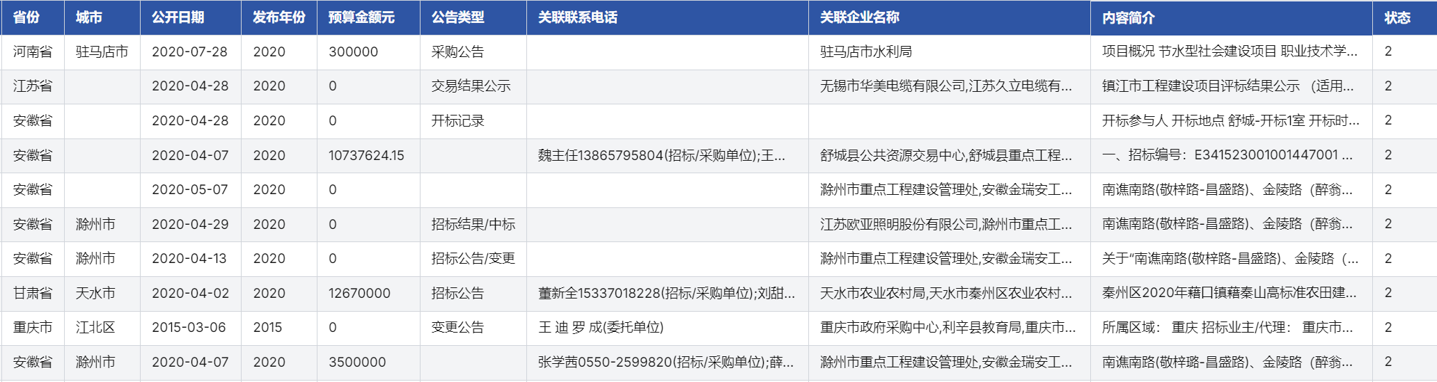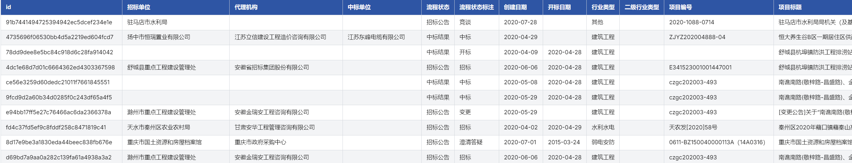 - 流程状态标注详细:部分项目流程状态标注详细(如招标公告、中标结果、变更公告),反映动态管理特征。