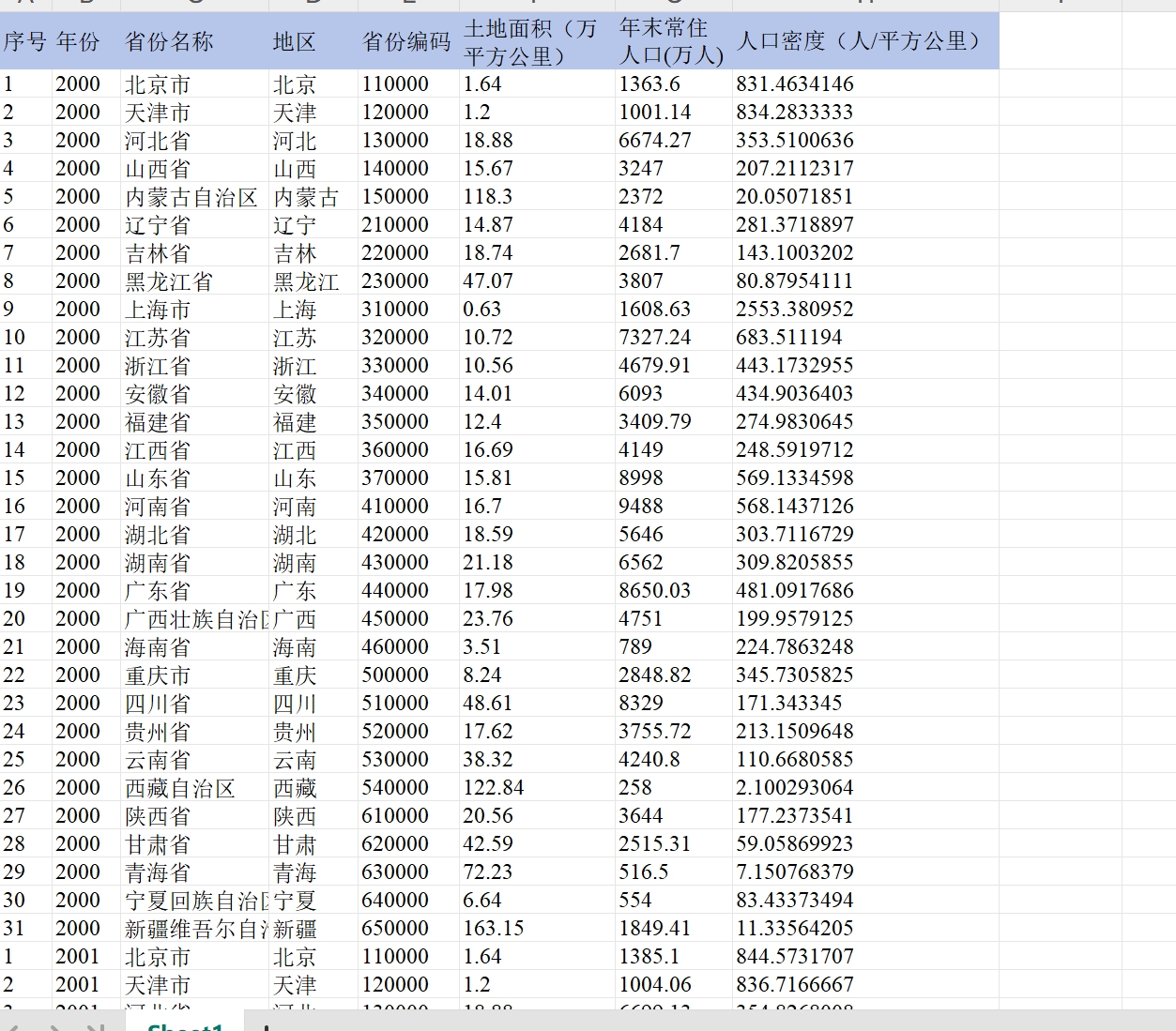 表一数据:31省常住人口、人口密度2000-2023,内含指标:省份、年份、常住人口(万人)、人口密度(人/平方公里)