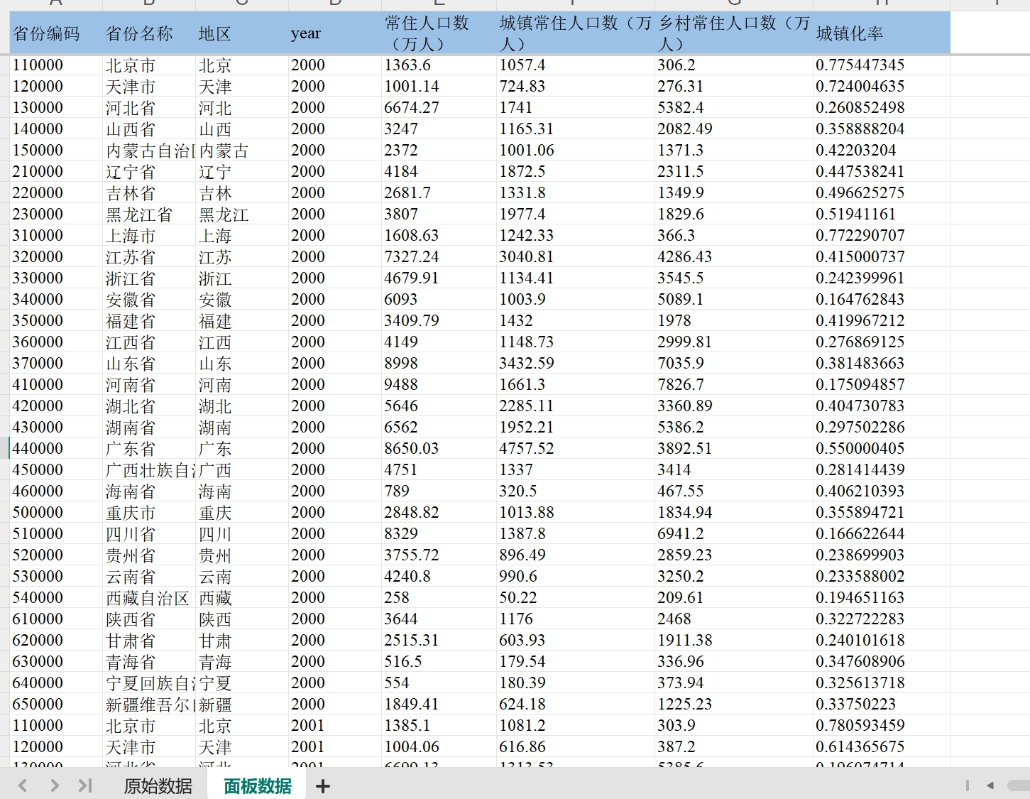 表二数据:31省城镇化率2000-2023,内含指标:省份、年份、常住人口数(万人)、城镇常住人口数(万人)、乡村常住人口数(万人)、城镇化率