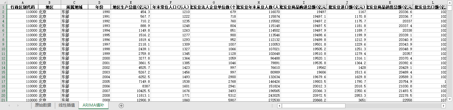 ARIMA填补。基于ARIMA模型,利用同一地区的时间序列数据,对缺失值进行预测填补。