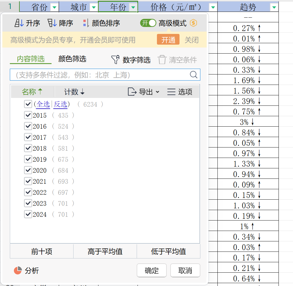 省份、城市、年份、价格(元/㎡)、趋势。