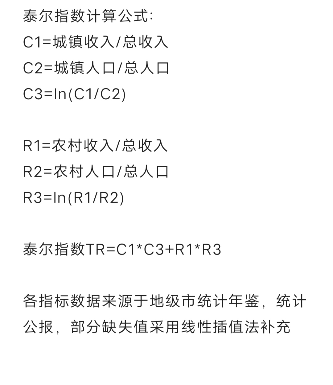 泰尔指数(Theil index)是由计量经济学家泰尔(Theil)在1967年提出的,主要用于衡量个人之间或者地区之间的收入差距(或经济不平等度)。它是反映一个国家或地区收入不平等程度的一种测度方法。泰尔指数的计算方法基于收入排序或人口分类,通过比较任意两个收入区间之间的差距来得出。该指数越高,意味着收入不平等程度越大。