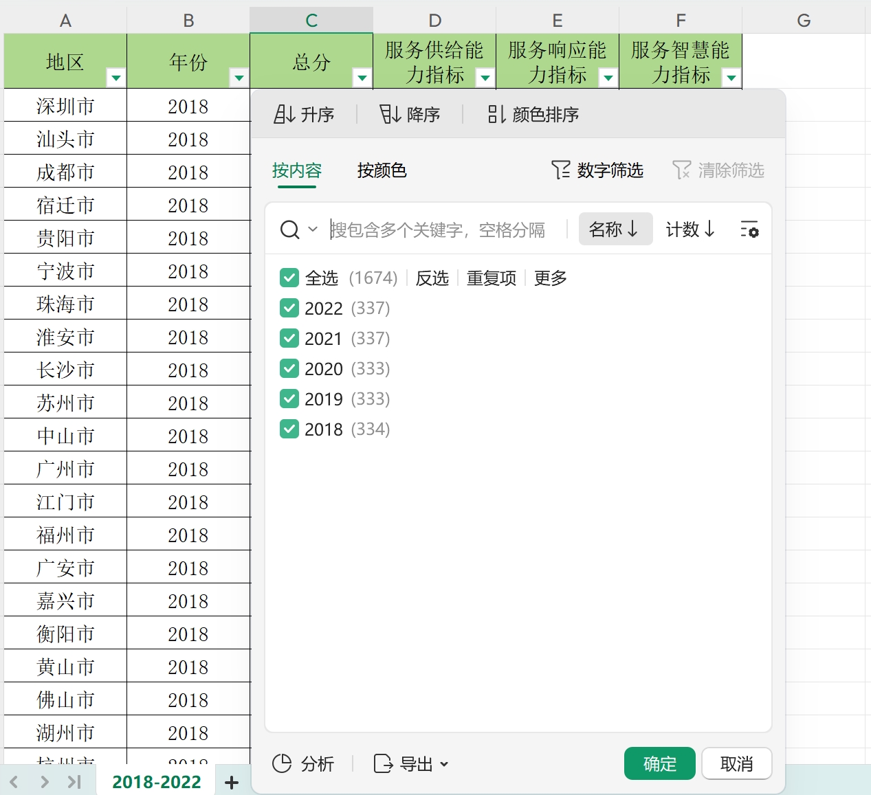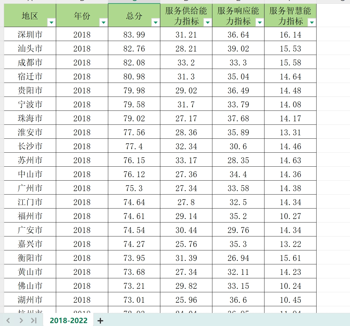 数据指标:城市、年份、总分、服务供给能力指标、服务响应能力指标、服务智慧能力指标。