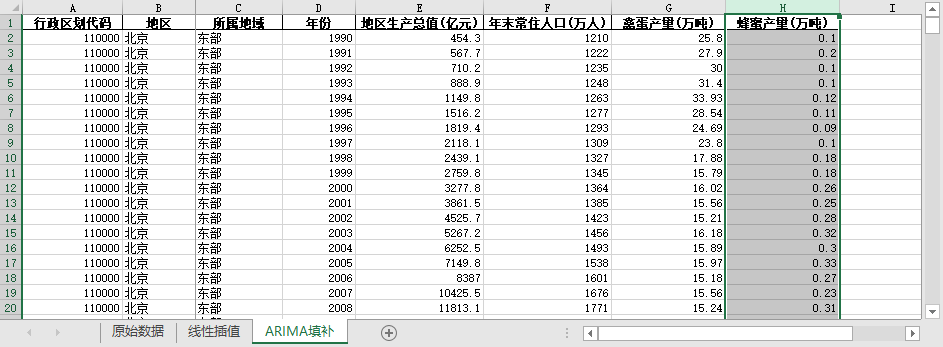 ARIMA填补。基于ARIMA模型,利用同一地区的时间序列数据,对缺失值进行预测填补。