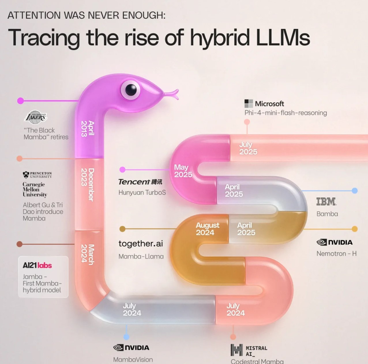 下图展示了Mamba发展史(同时也纪念了另外一个Black Mamba),可以看到近年来各大公司在SSM模型上的投入,几乎以SSM+Transformer的架构为主。这图其实并不完整,例如刚刚发布的Falcon-H模型就没有录入。