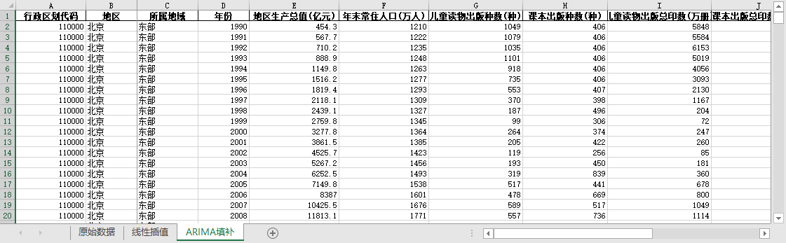 ARIMA填补。基于ARIMA模型,利用同一地区的时间序列数据,对缺失值进行预测填补。