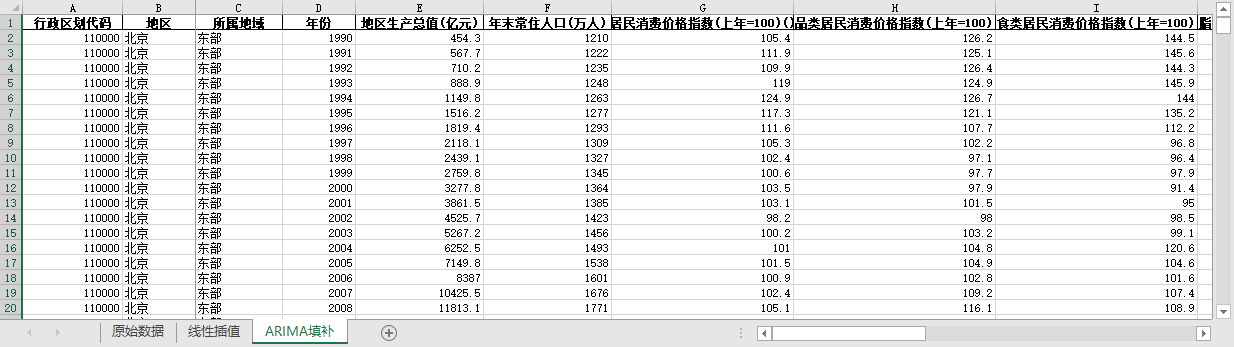 ARIMA填补。基于ARIMA模型,利用同一地区的时间序列数据,对缺失值进行预测填补。