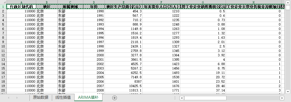 ARIMA填补。基于ARIMA模型,利用同一地区的时间序列数据,对缺失值进行预测填补。