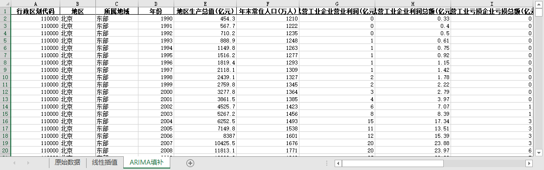 ARIMA填补。基于ARIMA模型,利用同一地区的时间序列数据,对缺失值进行预测填补。