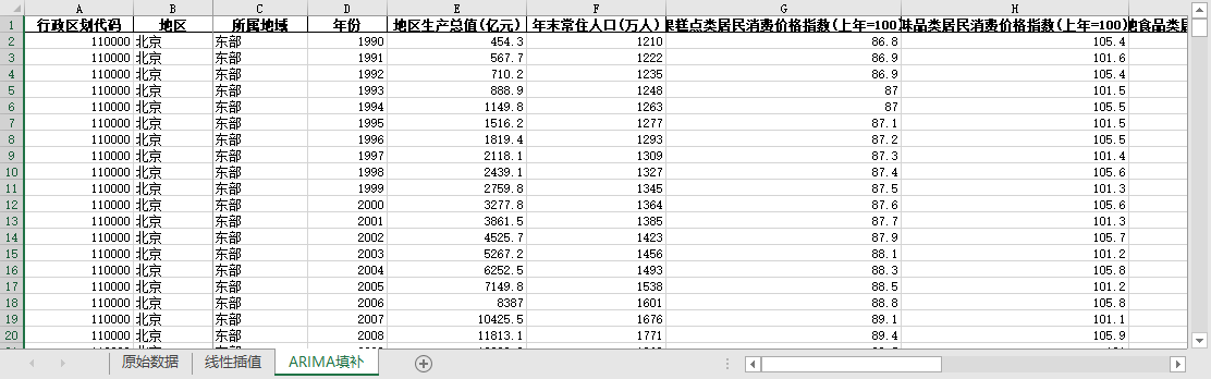 ARIMA填补。基于ARIMA模型,利用同一地区的时间序列数据,对缺失值进行预测填补。