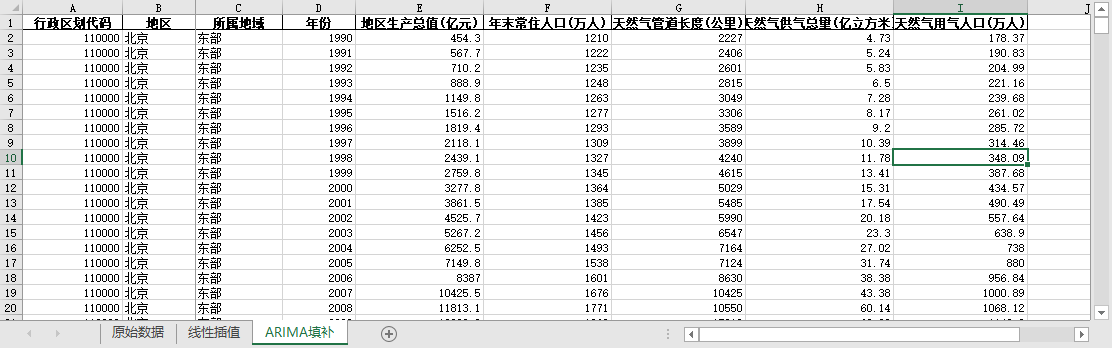 ARIMA填补。基于ARIMA模型,利用同一地区的时间序列数据,对缺失值进行预测填补。