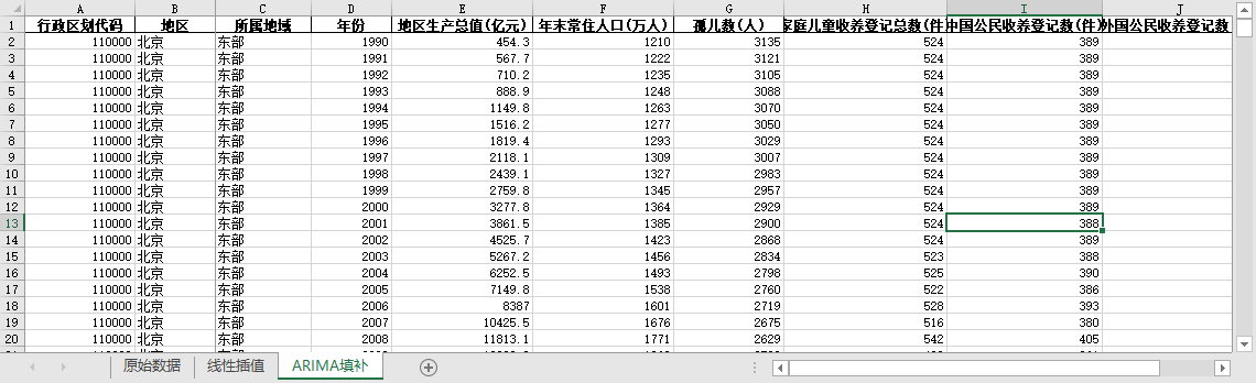 ARIMA填补。基于ARIMA模型,利用同一地区的时间序列数据,对缺失值进行预测填补。