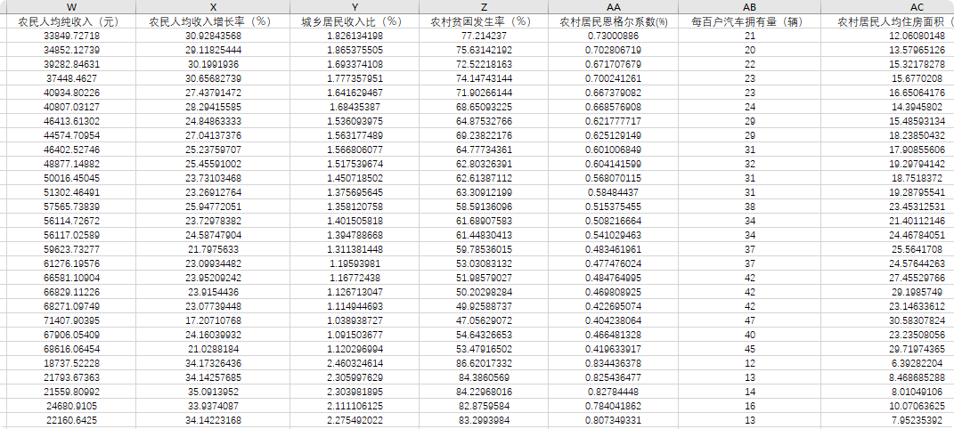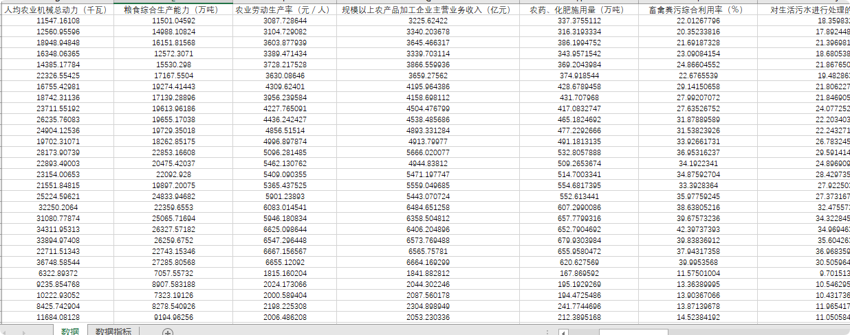 4、数据指标:人均农业机械总动力(千瓦)、粮食综合生产能力(万吨)、农业劳动生产率(元/人)、规模以上农产品加工企业主营业务收入(亿元)、农药、化肥施用量(万吨)、畜禽粪污综合利用率(%)、对生活污水进行处理的行政村占比(%)、对生活垃圾进行处理的行政村占比(%)、卫生厕所普及率(%)、农村绿化率(%)、农村居民教育文化娱乐支出占比(%)、农村义务教育学校专任教师本科以上学历比例(%)、农村居民平均受教育年限(年)、有线电视覆盖率(%)、开通互联网宽带业务的行政村比重(%)、乡村文化站数量(个)、村主任、书记”一肩挑“比例(%)、巳编制村庄规划的行政村占比(%)、已开展村庄整治的行政村占比(%)、农民人均纯收入(元)、农民人均收入增长率(%)、城乡居民收入比(%)、农村贫困发生率(%)、农村居民恩格尔系数(%)、每百户汽车拥有量(辆)、农村居民人均住房面积(平方米)、安全饮用水普及率(%)、村庄道路硬化率(%)、人均道路面积(平方米)、农村每千人拥有卫生技术人员数(人)。