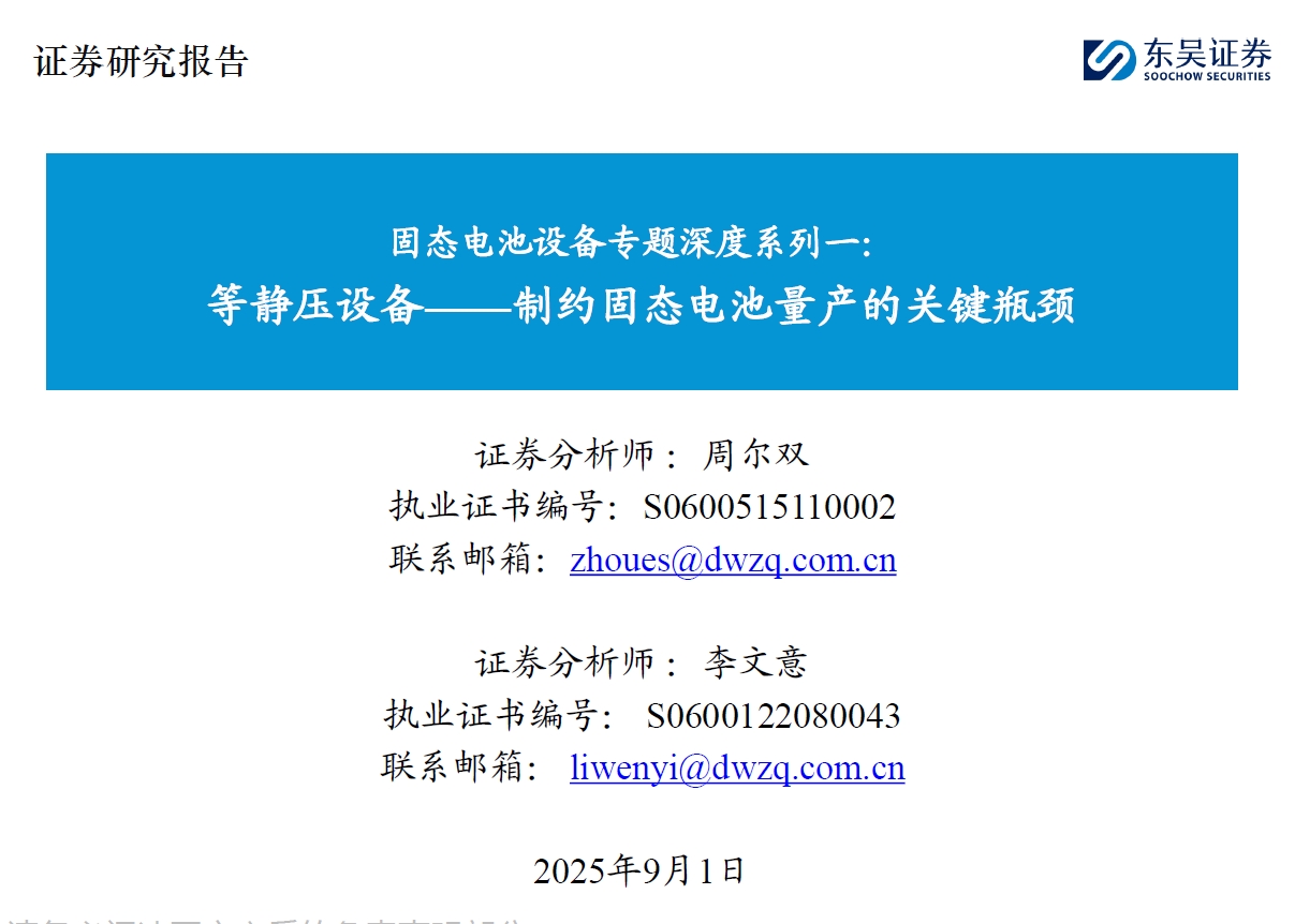 【东吴证券】固态电池设备专题深度系列一等静压设备制约固态电池量产的关键瓶颈.pdf