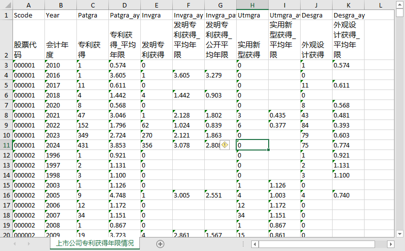[2]上市公司专利获得情况: 1990~ 2024 股票代码、会计年度、公司类型、获得时间、当年独立获得的发明数量、当年独立获得的实用新型数量、当年独立获得的外观设计数量、当年联合获得的发明数量、当年联合获得的实用新型数量、当年联